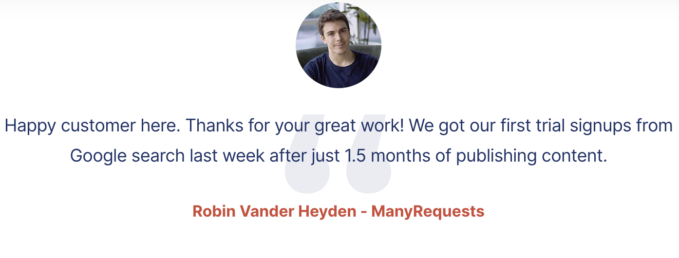 We don’t just regurgitate content we find on the internet. We actually take the time to understand your value proposition, survey your customers, and sign up for your product. We then use this information to write articles that appeal to customers’ pain points and show them how your product solves their pain points better than the alternatives.